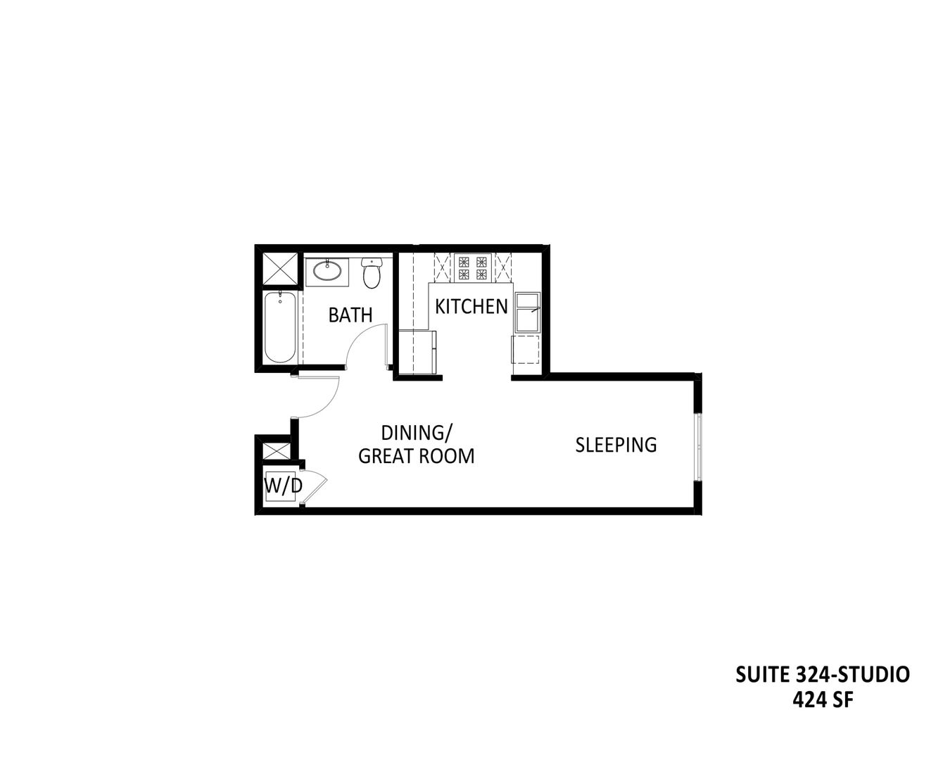 This studio apartment includes a full bath, electric stove/range, dishwasher, refrigerator and in unit washer/dryer (Additional Fee)